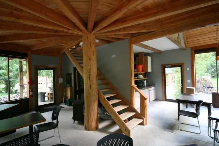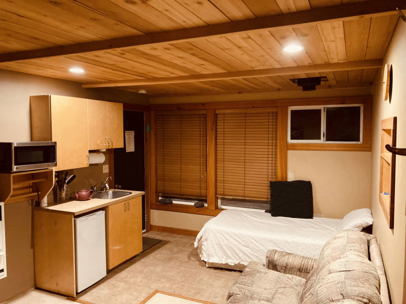 A two room loft above our woodshop. Separate bedroom has queen bed. Main room has couch, single bed, kitchenette (fridge, sink, microwave). Bathroom with tub.