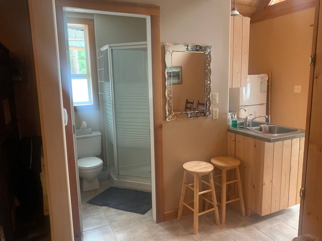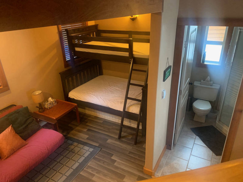 Roomy with cozy loft queen bed, double/single bunkbed, couch, kitchenette, fridge, microwave, double sink, table, burner, coffemaker & bathroom with shower.